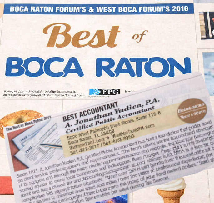 These are the services we have built our business on. If you’re in need of accounting or financial services, please give us a call. It would be our pleasure to apply our experience to your specific situation. At A. Jonathan Yudien, P.A. Certified Public Accountant (CPA) we specialize in financial consulting and services for corporations, startups, small businesses, sole proprietors and individuals. Voted “Best Accountant” in the Boca Raton Forum & West Boca Forum’s 2016 “Best of Boca Raton” voting and reported in the Sun Sentinel on March 16, 2016.